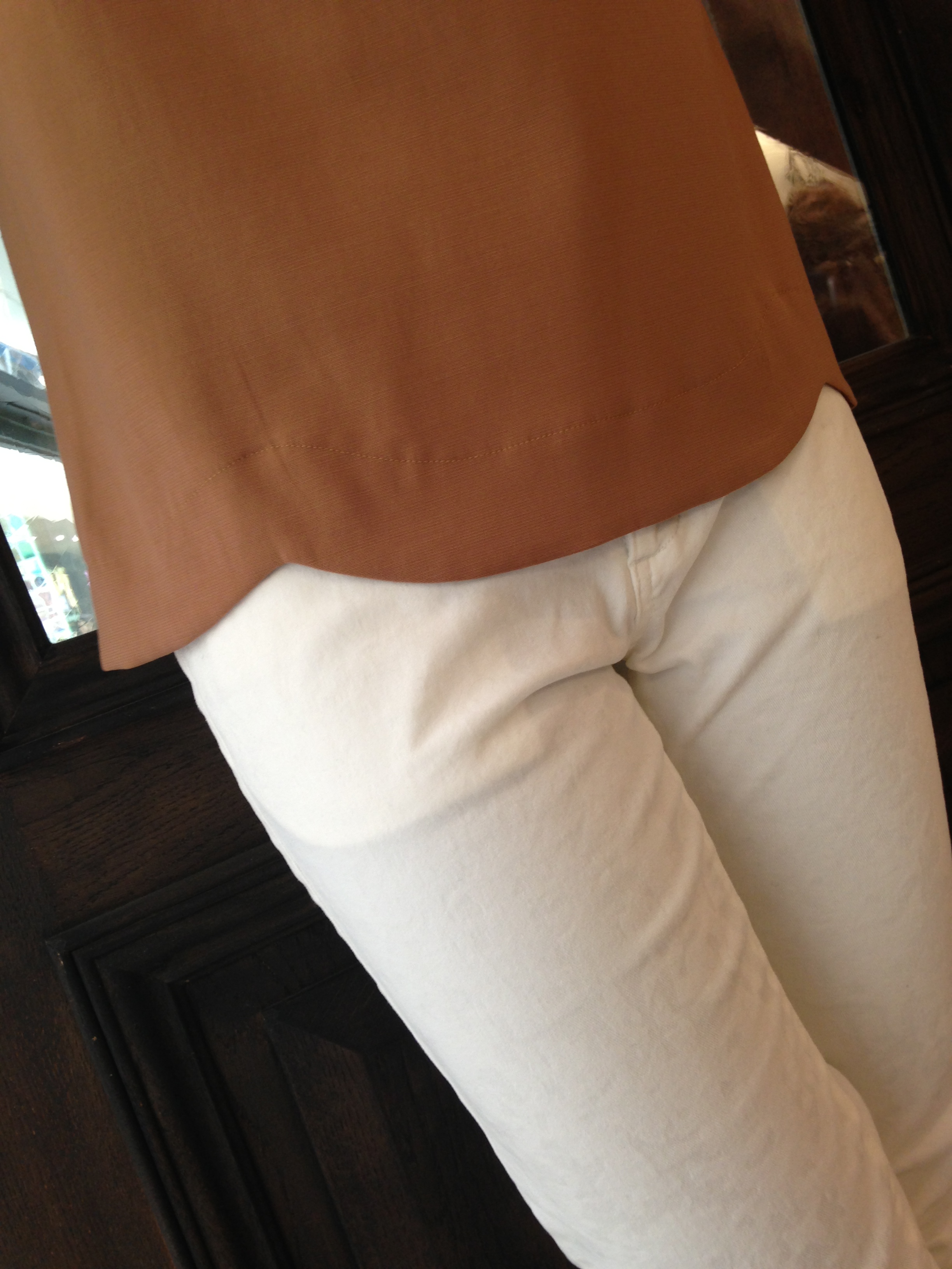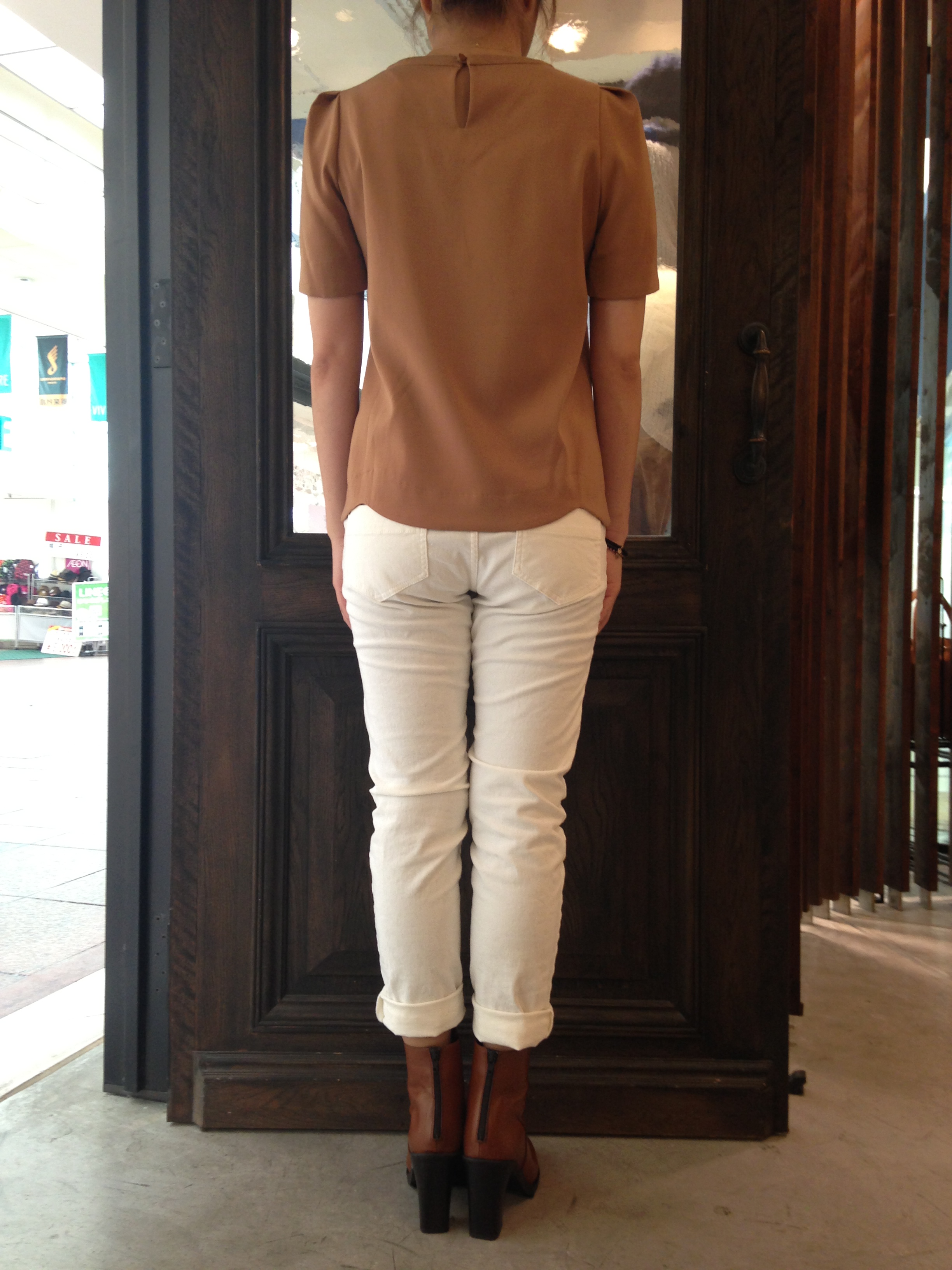 キャメルとホワイトで まとめ、グリーンのクラッチBagをアクセントにした、シンプルなスタイリング。。。